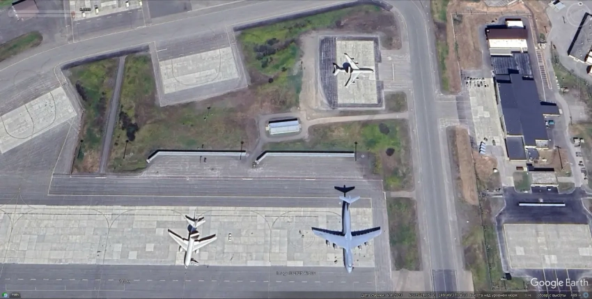 Спутниковый снимок Google Earth: самолёт ДРЛО Boeing E-3G Sentry и самолёты-заправщики Boeing KC-135 на авиабазе Милденхолл в Великобритании. Снимок сделан в июне 2022 года