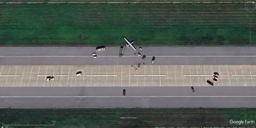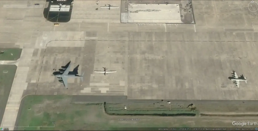 Спутниковый снимок Google Earth: БПЛА над взлётно-посадочной полосой авиабазы Крич