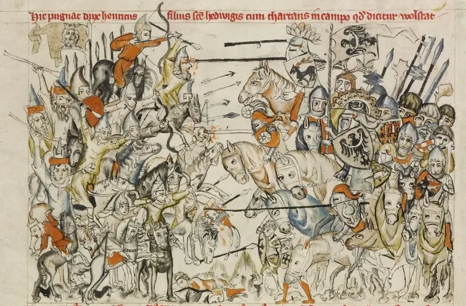 Битва при Легнице. Иллюстрация из манускрипта «Легенды о святой Хедвиге», 1353 г. Музей Дж. Пола Гетти, Лос-Анджелес