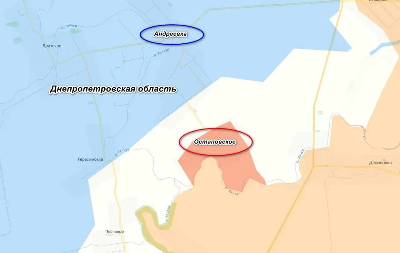 Всего российские бойцы освободили порядка пяти квадратных километров территории, взят под контроль очередной узел обороны противника в Днепропетровской области. Противник потерял в боях за село порядка роты личного состава и более 10 единиц техники. Как предполагается, после Остаповского наши пойдут на Андреевку, расположенную севернее. Тем более, что украинский гарнизон этого села отрезан от снабжения после уничтожения моста через реку Гайчур.