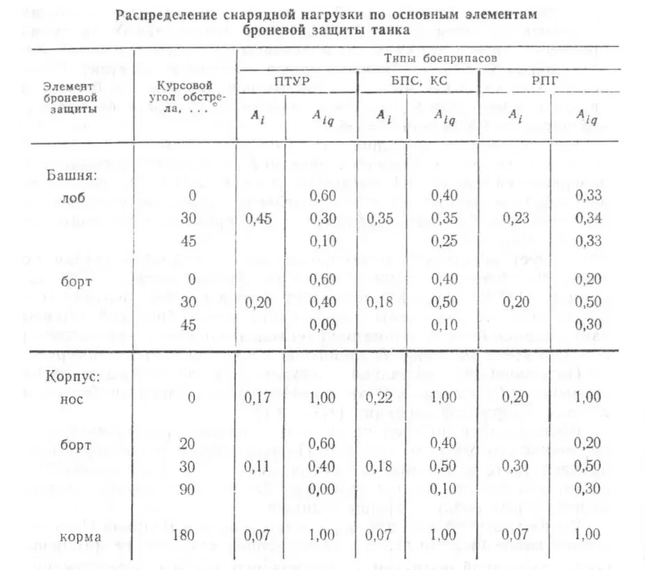 Для понимания, как всё это выглядит в цифрах, посмотрим на таблицу, взятую из первого тома «Военных гусеничных машин» для студентов МГТУ им. Баумана за 1990 год. А — распределение снарядной нагрузки по элементам броневой защиты с учётом их площадей проекций. Aiq — распределение снарядной нагрузки по элементам броневой защиты при фиксированных курсовых углах обстрела.