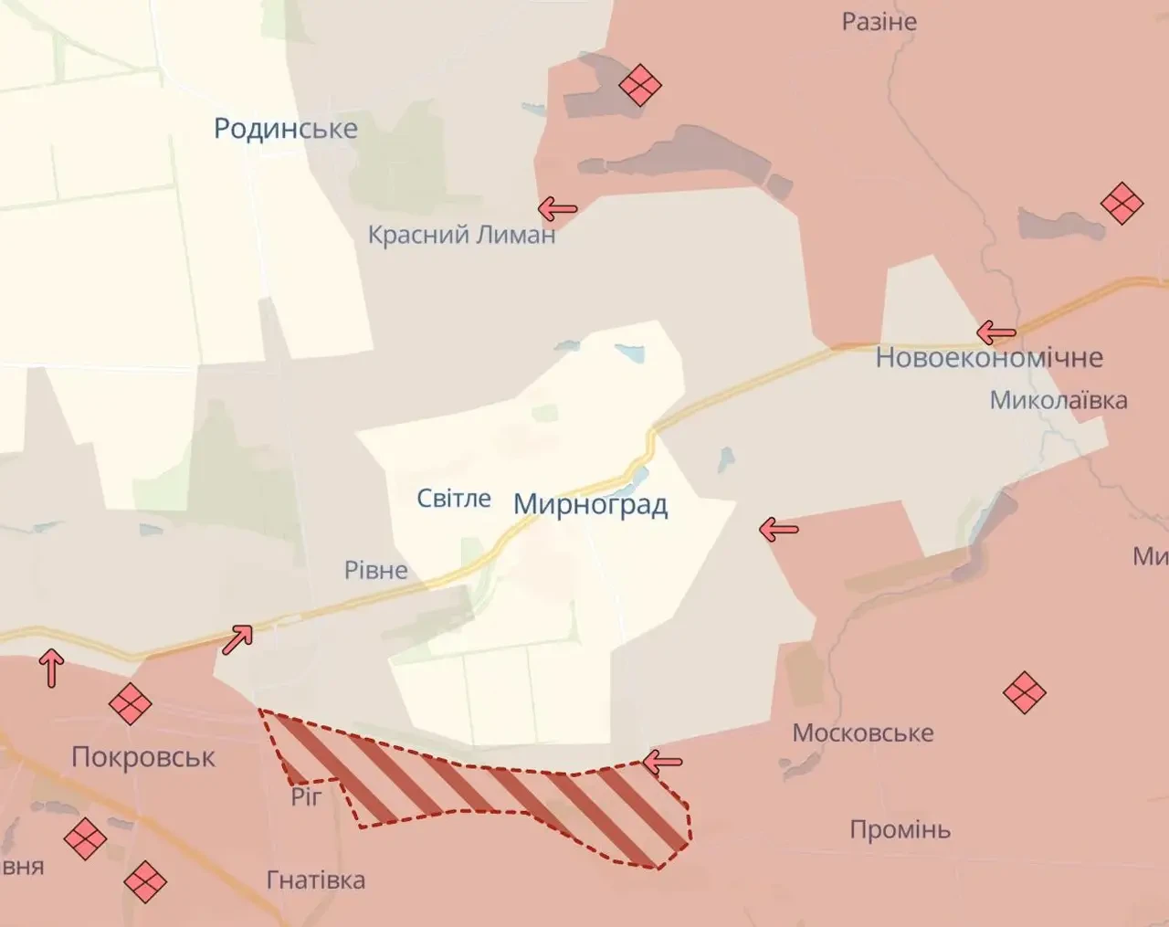 Украинские мониторинговые паблики вступают в заочную полемику с главкомом Сырский, заявляющим, что в Покровске и Мирнограде «ситуация сложная, но контролируемая». Связанный с ГУР Украины инфоресурс DS представляет свои карты, в титрах под которыми констатирует, что контроля давно нет. При этом тот же паблик пытается играть в традиционный «антикриз», отмечая на карте контуры серой зоны, вызывающие вопросы даже среди украинских пользователей.