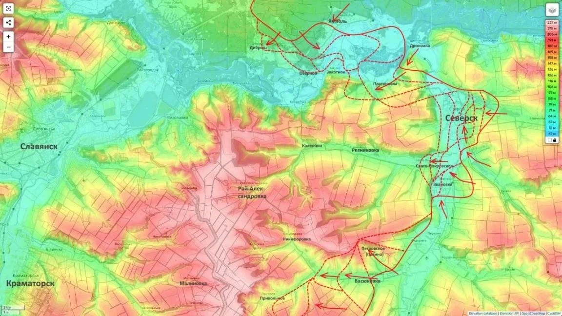Подразделения российской армии применяют тактику многостороннего охвата, приближаясь к вражеским позициям с трех направлений одновременно: с севера идут интенсивные бои в районе Закотного, где украинские формирования оборудовали наиболее масштабную и подготовленную линию обороны. С юга продолжается продвижение в направлении Кирово, где занят ряд опорных пунктов. С востока наступательные действия ведутся непосредственно от Северска в сторону мелового карьера.