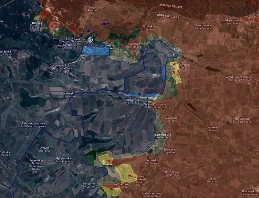 На Северском направлении ресурсы противника уже признали полную потерю Северска и территорий южнее города. ВС РФ «на плечах» противника, отступающего в сторону Кривой Луки и Рай-Александровки, продвигаются западнее от города и занимают огневые позиции на высотах севернее Резняковки и Свято-Покровского и южнее дороги на Красный Лиман. В Свято-Покровском продолжаются бои, но, вероятно, скоро противник либо окажется в окружении, либо будет отступать к Рай-Александровке.