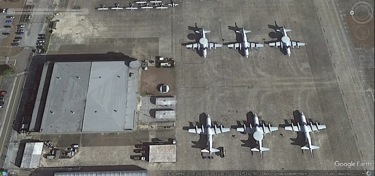 Спутниковый снимок Gооglе Eаrth: самолёты Lockheed P-3 LRT Orion и Lockheed P-3 AEW Orion на аэродроме Сесил-Филд. Снимок сделан в январе 2021 года