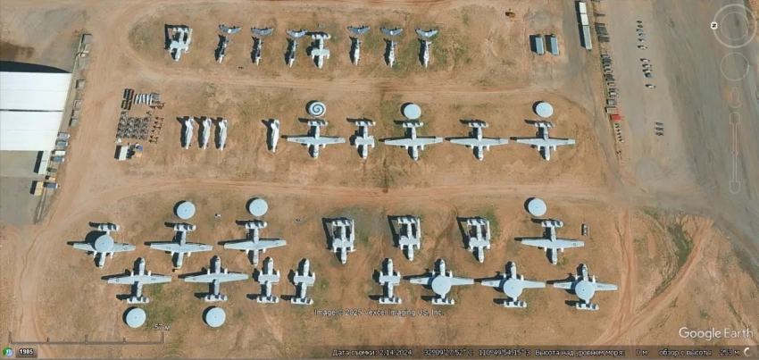 Спутниковый снимок Gооglе Eаrth: самолёты Lockheed EP-3E Aries II на базе хранения авиационной техники Девис-Монтен