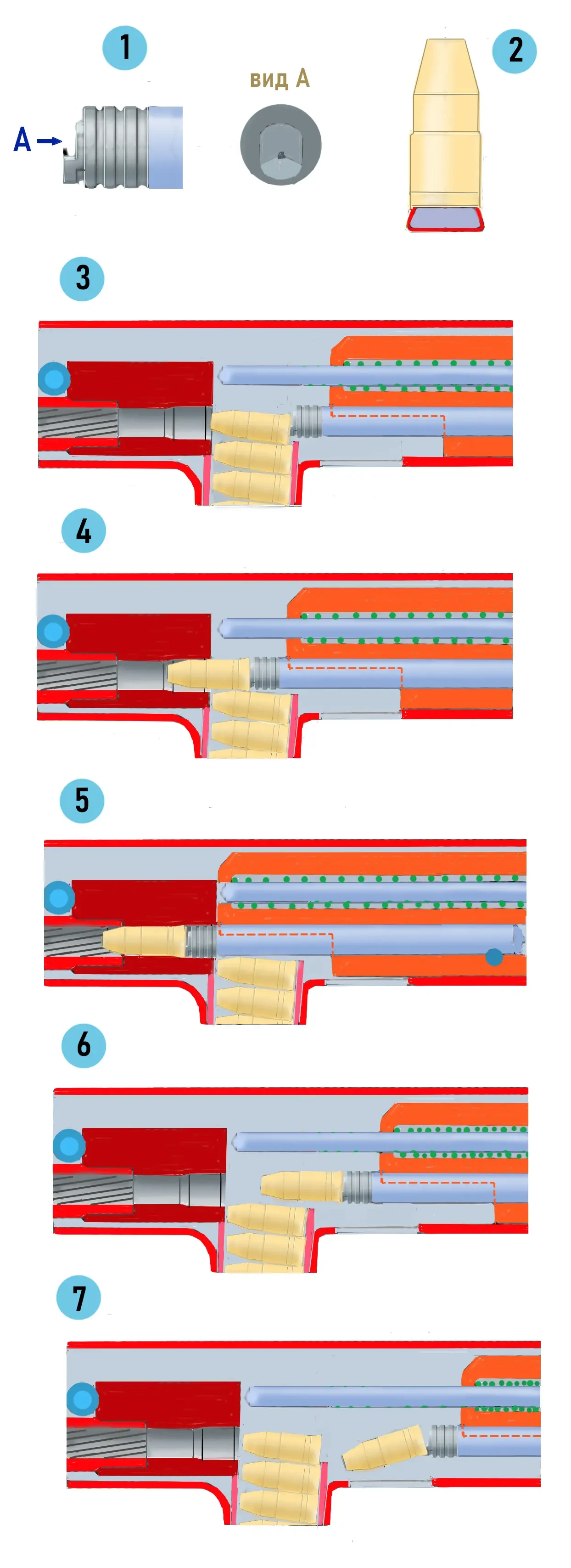 Схема работы системы экстракции пистолета пулемета CB-M2: 1 – затвор-поршень, А – зеркало затвора, 2 – пуля с гильзой, частично в разрезе, 3 – патрон на подаче, 4 – патрон подается в патронник, 5 – патрон в патроннике, затвор полностью входит в патронник, 6 – выстрел не произошел, при передергивании затвора он идет назад, извлекая при этом из ствола осечный боеприпас, 7 – при дальнейшем движении ствола назад происходит удаление осечного боеприпаса через окно в нижней части ствольной коробки. Рис. А Шепса