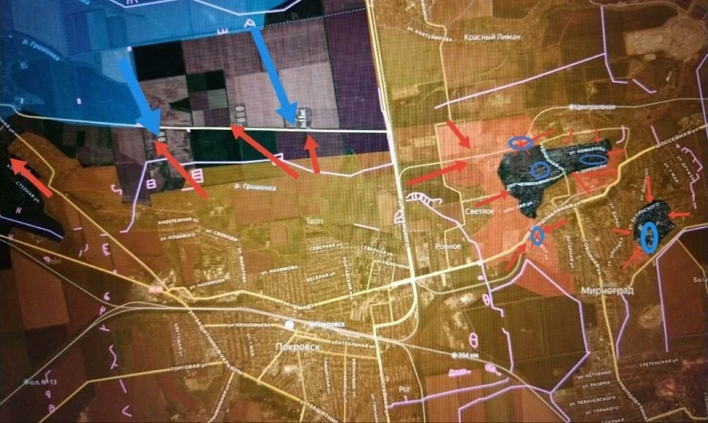 На Красноармейском фронте российские подразделения ведут встречные бои на западной окраине Новоподгороднего. Пробив оборону ВСУ севернее шахтоуправления «Покровское», наши пробиваются к Сергеевке. Идут встречные бои в Гришино. Минобороны России сообщило об освобождении Светлого - села с довоенным населением около тысячи человек на западных окраинах Димитрова у трассы, соединяющей этот город с Красноармейском. Наши продвигаются внутри Димитровского котла. В ожесточённых боях в районе Новое Шахово российские бойцы восстановили контроль над участком трассы к Золотому Колодезю. Также наши вернули контроль над Софиевкой.