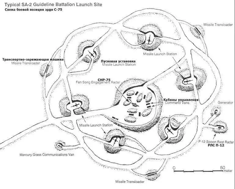 Такая же или несколько упрощённая схема построения огневой позиции впоследствии применялась на комплексах поздних модификаций, что позволяло легко идентифицировать ЗРК семейства С-75 на аэрофотоснимках и изображениях, полученных с разведывательных спутников. В большинстве случаев пусковые установки располагались вокруг станции наведения. Иногда на позиции дороги прокладывались так, что она приобретала форму «Звезды Давида».