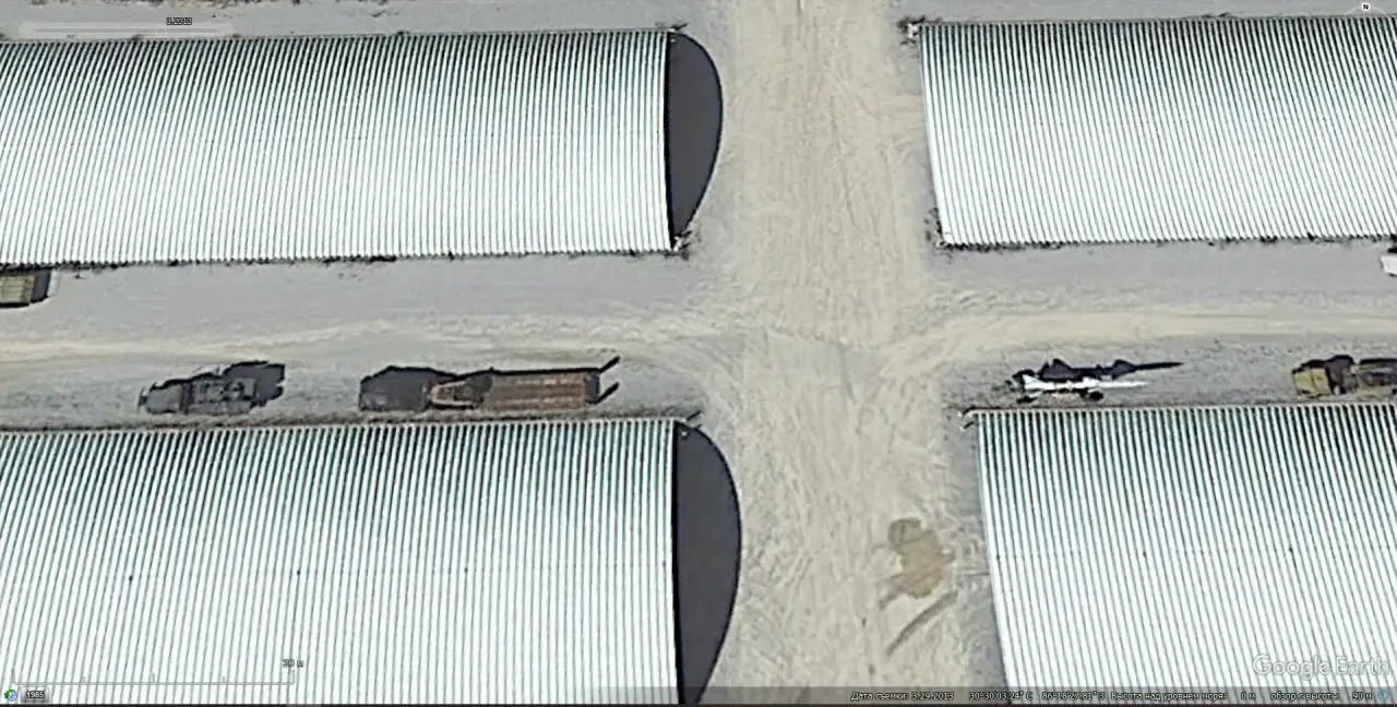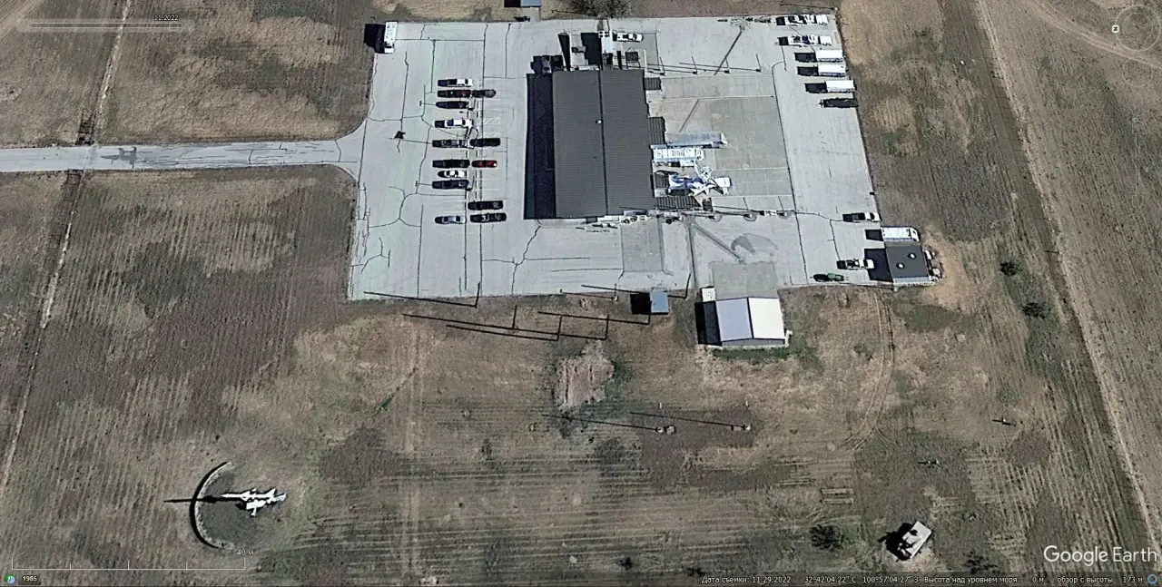 Спутниковый снимок Google Earth: площадка компании AHNTECH Inc. на аэродроме Уинстон Фильд в Техасе. Рядом со зданиями расположены буксируемые радиолокационные имитаторы, в 30 м к северо-востоку от бетонированной площадки пусковая установка ЗРК С-75. Снимок сделан в ноябре 2022 года