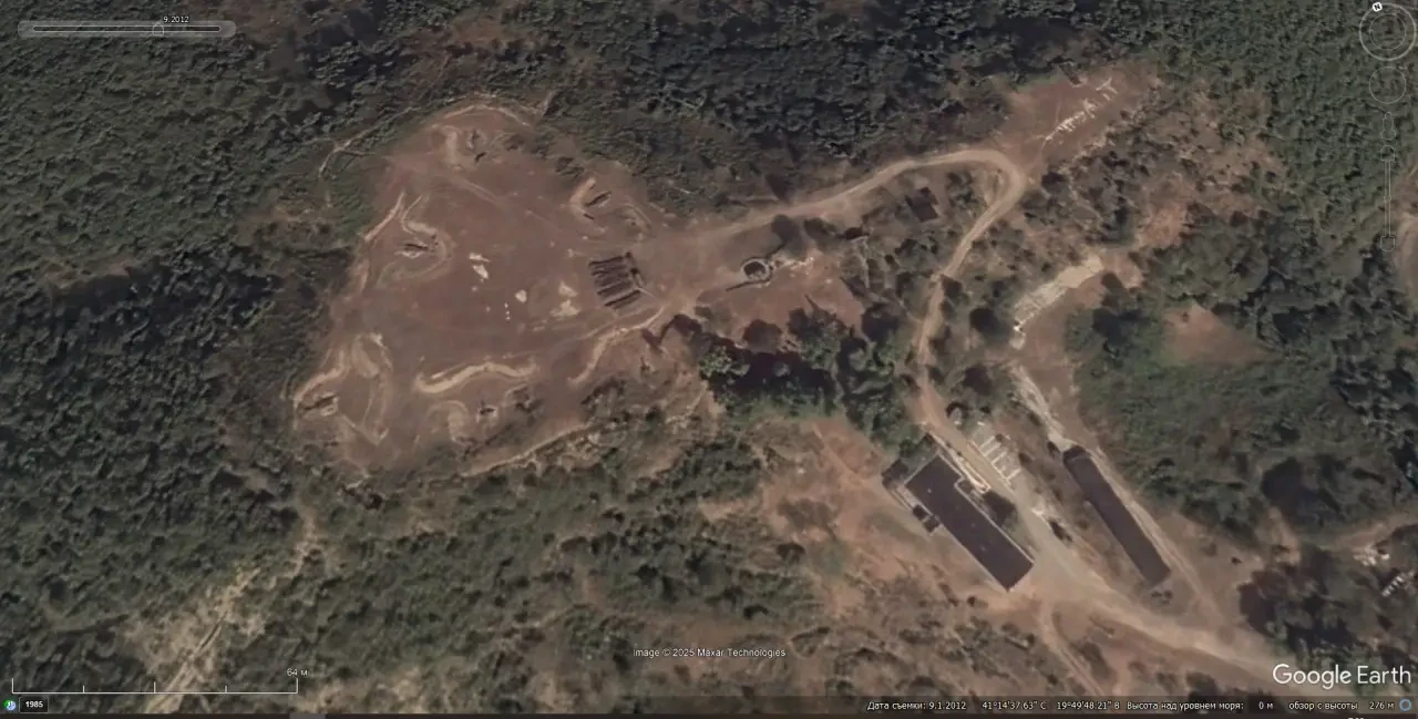 Спутниковый снимок Google Earth: позиция ЗРК HQ-2А на вершине горы в 5 км южней Тираны. Видно, что на пусковых установках зенитных ракет нет. Снимок сделан в сентябре 2012 года