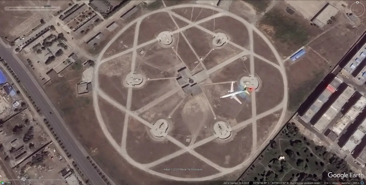Спутниковый снимок Google Earth: авиалайнер пролетает над позицией ЗРК HQ-2, расположенной в окрестностях административного центра Урумчи, в Синьцзян-Уйгурском автономном районе. Снимок сделан в августе 2014 года