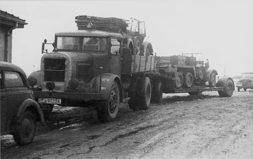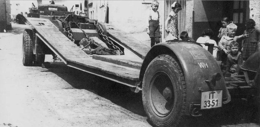 На фотографиях запечатлён эпизод работы немецкого эвакуатора. Легковой автомобиль офицера Люфтваффе вышел из строя и теперь эвакуируется с помощью одного из тяжёлых низкорамных прицепов вермахта – Sd.Ah. 115 в 10-тонном варианте. Sd.Ah. 115 (Sonderanhänger 115 – специальный прицеп 115) – это тяжёлый низкорамный трал, разработанный фирмой Goldhofer и производившийся с 1937 года. 10-тонная версия предназначалась для перевозки лёгкой и средней бронетехники, повреждённых автомобилей и тяжёлых грузов. Прицеп имел низкую погрузочную платформу, аппарели для заезда и мог буксироваться мощными полугусеничными тягачами (например, Sd.Kfz. 7 или Sd.Kfz. 9)