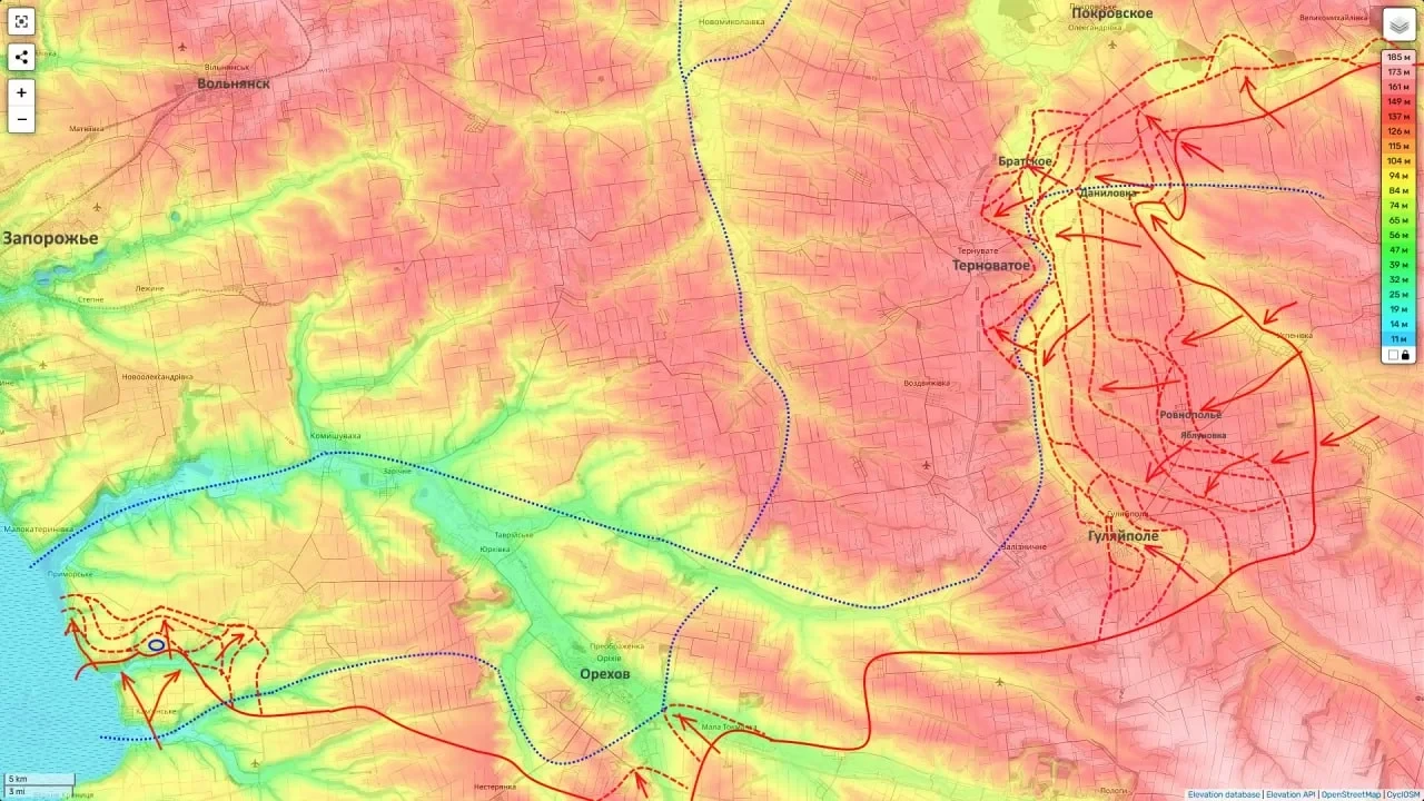 Российским подразделениям удалось охватить с трех сторон запорожский поселок Терноватое, взяв под контроль расположенное рядом с ним село Заречное, сообщил в сводке Юрий Подоляка.