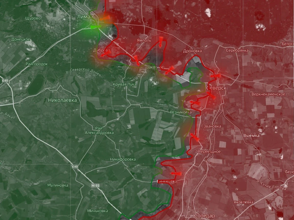 Украинский генштаб признал, наконец, потерю Северска. Между тем, ВС РФ ведут бои на рубеже Хромовка-Бондарное и продвигаются широким фронтом в направлении на Рай-Александровку. Севернее и южнее Резниковки наши части занимают новые позиции, в том числе на высотах выше Резниковки. В районе Закотного продолжаются бои, но враг удерживает позиции на высотах восточнее села.
