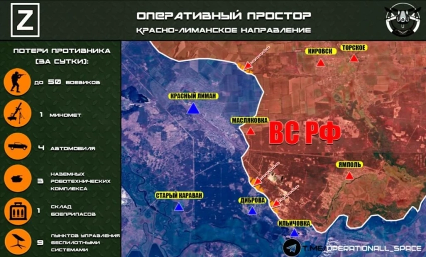 Здесь ВС РФ наращивают давление севернее и восточнее Лимана, выходя к дороге Закотное–Лиман и усиливая воздействие на логистику противника.