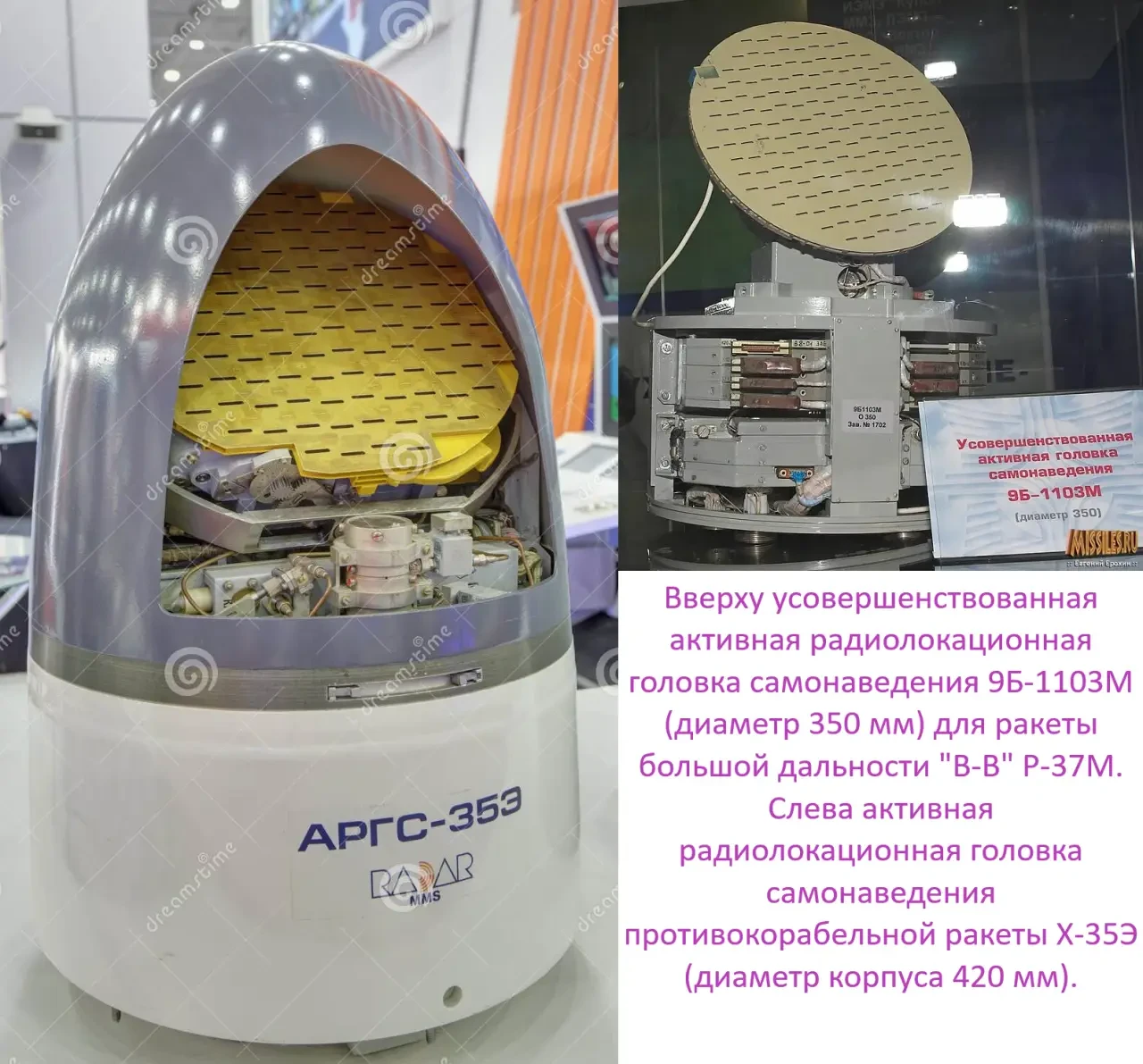 У противника ПКР Harpoon RGM-84D2 имеет диаметр корпуса 343 мм, а АРГСН работает в диапазоне 15,3–17,2 ГГц (λ = 19,7–17,4 мм), что позволяет ей обнаруживать цели на дальности до 40 километров узким радиолокационным лучом, формируемым ФАР ГСН. Такая же дальность обнаружения и у АРГСН 9Б-1103М-350, но уже по самолёту с ЭПР 5 кв. метров. Если применить известные формулы, то можно с высокой долей вероятности оценить угловую ширину диаграммы направленности антенн ГСН упомянутых ракет в пределах плюс/минус трёх градусов и в угломестной, и в азимутальной плоскостях. Сравнительно небольшие коэффициенты усиления антенн (из-за малых геометрических размеров, ограниченных корпусами ракет) компенсируются приличной импульсной мощностью зондирующих сигналов, например, у ПКР Harpoon RGM-84D2 она заявлена на уровне 35 кВт.