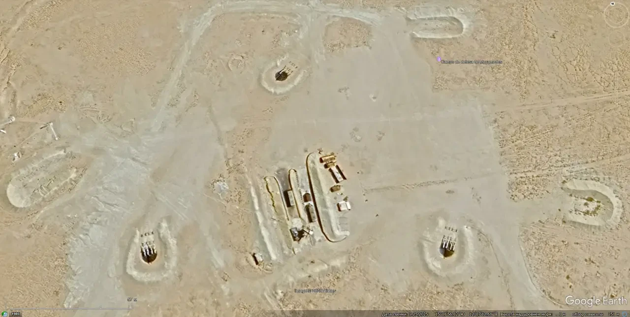 Спутниковый снимок Googlе Eаrth: позиция ЗРК С-125 в 12 км северо-западней Каира. Видно, что на позиции осталось две пусковых установки без ракет. Снимок сделан в апреле 2025 года