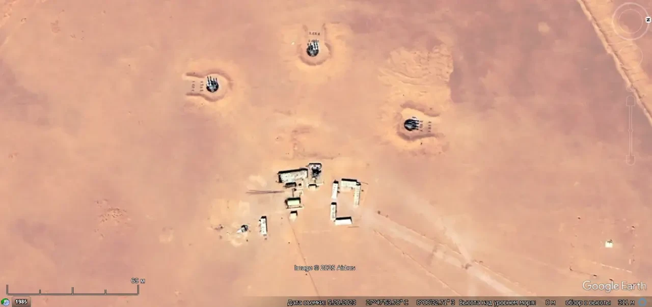 Спутниковый снимок Googlе Eаrth: позиция ЗРК С-125М1А на северной окраине города Тиндуф. Только две пусковые снаряжены парой ракет. Снимок сделан в мае 2023 года