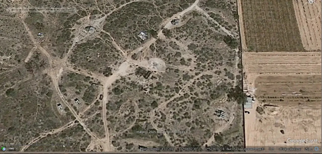 Спутниковый снимок Googlе Eаrth: эта же позиция ЗРК С-125М1 в восточной части Триполи. Снимок сделан в сентябре 2012 года