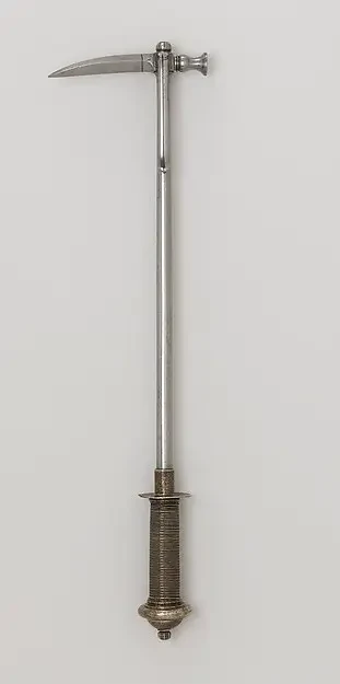 Гвизарма 1500 г. Тут тебе и протыкающие кольчугу и доспехи шипы, и крюк, сбрасывать всадников с коня и рубящий клинок. Такое вот страшное универсальное оружие пехотинца. Метрополитен музей, Нью-Йорк