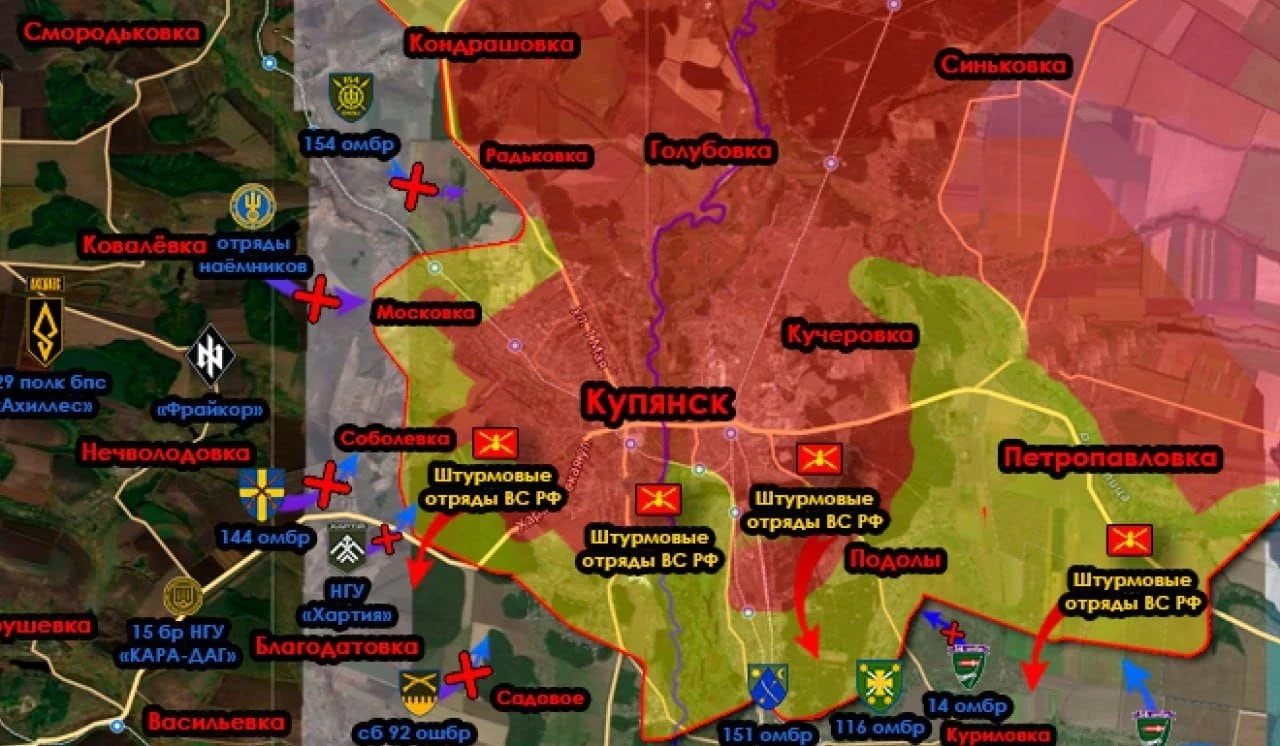 «На Купянском направлении в течение суток отражены две контратаки подразделений 92-й штурмовой бригады ВСУ в районах населенных пунктов Нечволодовка и Благодатовка с целью прорыва в Купянск. Уничтожено до 10 боевиков», - проинформировал Бигма.