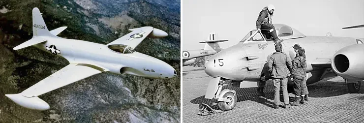 На фото слева: Lockheed P-80 – первый американский реактивный истребитель, сыгравший решающую роль на передовой в начале Корейской войны (1950-1953) в качестве штурмовика и истребителя, прежде чем был превзойдён советским МиГ-15. На фото справа: Gloster Meteor в основном состоял на вооружении 77-й эскадрильи ВВС Австралии во время Корейской войны, первоначально как истребитель воздушного боя, но быстро переключился на роль штурмовика после того, как так же, как и Lockheed P-80, был превзойден в воздушных боях более быстрыми советскими МиГ-15