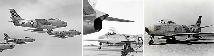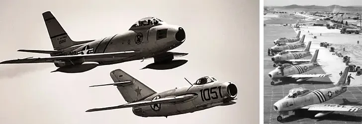 F-86 Sabre – первый американский реактивный истребитель с крылом стреловидной формы. Конструкторы «Сейбра», как и конструкторы Миг-15, использовали захваченные немецкие расчетные данные, которые показали, что стреловидные крылья замедляют эффекты сжимаемости воздуха, возникающие на высоких дозвуковых скоростях, т. е. стреловидное крыло позволяет обойти волновой кризис, который неизменно возникает при приближении скорости самолёта к скорости звука, в отличие от аналогичных самолетов с прямым крылом. «Сейбры» участвовали в боях против МиГ-15 во время Корейской войны и большую часть своих вылетов совершили с авиабазы Кимпо недалеко от Сеула