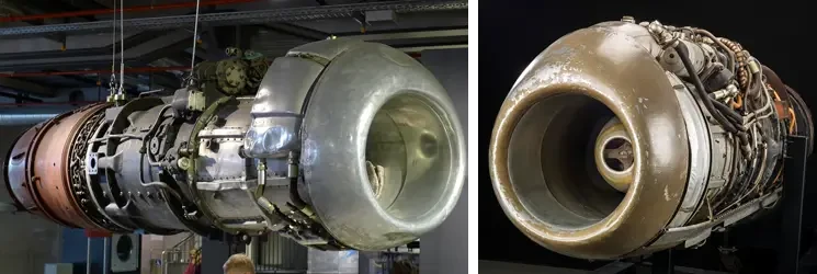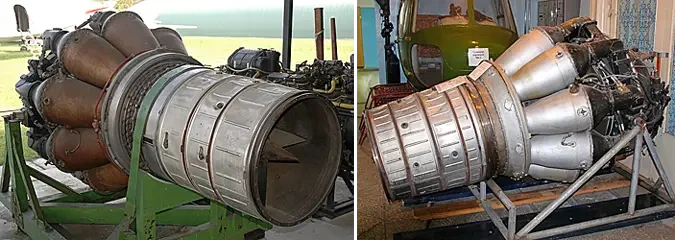 На фото слева: двигатель РД-45. Советская копия двигателя Rolls-Royce Nene, созданного методом обратного проектирования. Имел решающее значение для обеспечения работы первых советских реактивных самолетов, таких как знаменитый истребитель МиГ-15. На фото справа: двигатель ВК-1 – более усовершенствованный аналог двигателя РД-45/РД-45Ф