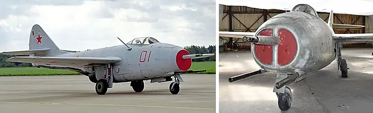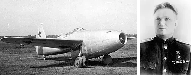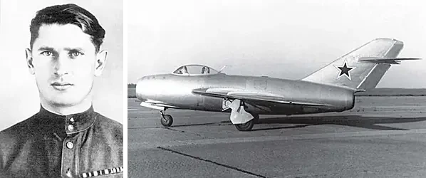 На фото слева: лётчик-испытатель В. Н. Юганов (1922–1964), поднявший в небо МиГ-15. На фото справа: первый прототип истребителя МиГ-15