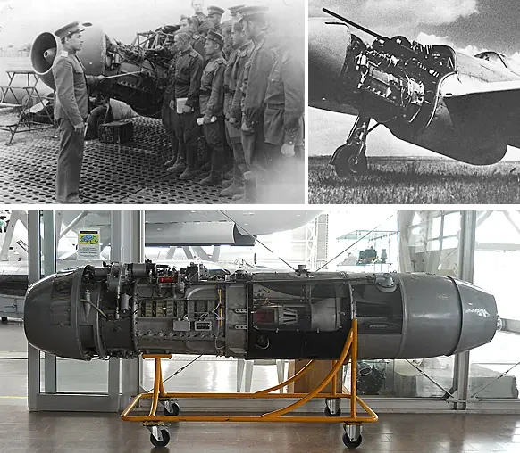 На верхнем фото слева: обучение технического персонала работе с двигателем РД-10. На верхнем фото справа: двигатель РД-10, установленный на истребитель МиГ-15. Фото снизу: музейный экспонат двигателя