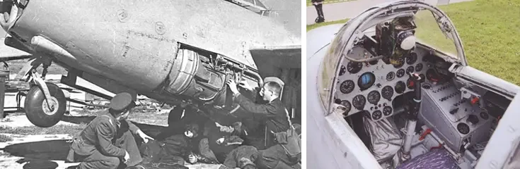 На фото слева: техническое обслуживание МиГ-9. На фото справа: кабина истребителя МиГ-9