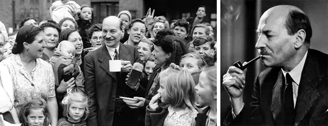 Клемент Эттли (1883–1967). После победы лейбористов на выборах 1945 года правительство Эттли выполнило большинство своих предвыборных обещаний – особенно проведенные его правительством реформы системы социального обеспечения, создание Национальной службы здравоохранения и сохранение т. н. «особых отношений» с США. Во время правления Эттли была проведена деколонизация, а по сути – добровольная ликвидация Британской империи, в результате которой в 1947 году сначала Индия и Пакистан получили независимость, а затем Бирма и Цейлон, что привело к преобразованию Британской империи в Содружество. Многие его считали слишком левым, ибо его политические взгляды сформировались под влиянием его работы в небогатом лондонском Ист-Энде