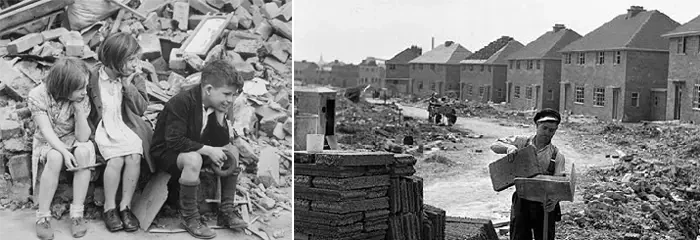 Великобритания потратила на войну примерно четверть своего национального богатства, столкнулась с опустошенной экономикой, огромным долгом, потерей богатства, масштабными разрушениями, жестким нормированием и дефицитом, что привело к «эпохе жесткой экономии», характеризующейся государственным контролем, высокими налогами и продолжающимся нормированием. Дома, заводы и инфраструктура были сильно повреждены, а жизненно важные торговые суда потоплены. Продукты питания, сырье и товары первой необходимости были в дефиците, что потребовало продолжения нормирования – например, хлеба и топлива
