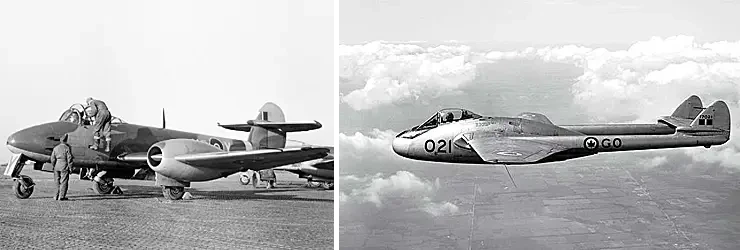 На фото слева: Gloster Meteor – первый британский реактивный истребитель и единственный реактивный самолёт союзников, принимавший участие во Второй мировой войне с двигателем Derwent. На фото справа: De Havilland Vampire – второй реактивный самолёт Королевских ВВС, состоял на вооружении в 1945-1955 годах. В приобретении этих самолетов советской стороне было отказано...