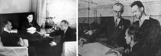На фото слева: В. Я. Климов и Н. Н. Поликарпов в кабинете у А. И. Микояна (1940 год). На фото справа: в конструкторском бюро В. Я. Климова