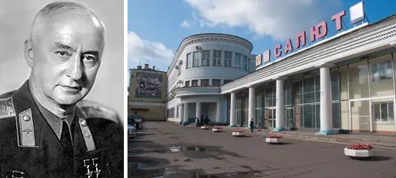 На фото слева: В. Я. Климов (1892–1962) – советский конструктор авиационных двигателей и академик, основатель Объединенного двигателестроительного предприятия «Климов». Он известен прежде всего разработкой высокоэффективных поршневых двигателей, которые устанавливались примерно на 90 % советских истребителей во время Второй мировой войны, а также созданием первых советских реактивных двигателей. На фото справа: московский моторостроительный заводе № 45 (ныне «ОДК-Салют»)