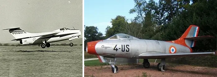 На фото слева: FMA I.Ae. 33 Pulqui II – аргентинский многоцелевой реактивный истребитель с турбореактивным двигателем Rolls-Royce Nene. На фото справа: Dassault Ouragan – французский истребитель, первый серийный реактивный самолёт ВВС Франции. На нем тоже установлен британский двигатель Rolls-Royce Nene (Hispano-Suiza Nene)
