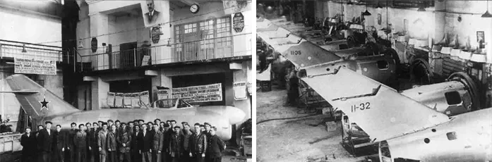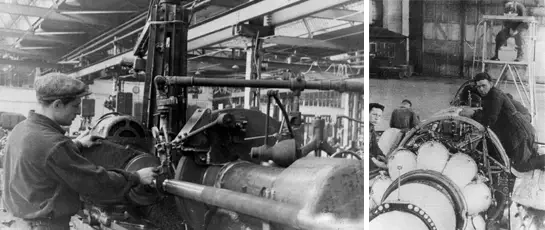 На фото слева: коллектив разработчиков истребителя МиГ-15. На фото справа: сборка хвостовых частей самолета