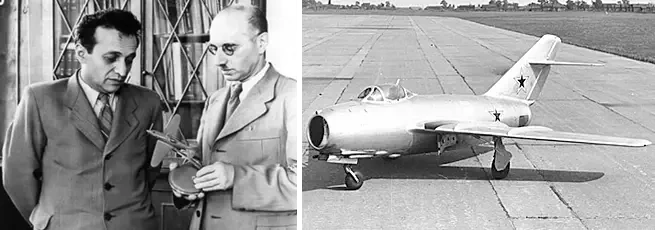 На фото слева: А. И. Микоян и М. И. Гуревич. На фото справа: один из первых истребителей МиГ-15