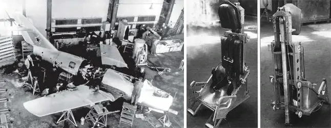 На фото слева: сборка истребителя МиГ-15. На фото в центре и справа: катапультное кресло