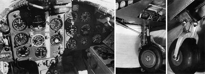 На фото слева: приборная панель истребителя МиГ-15 с пилотажно-навигационными и контрольно-измерительными приборами, питание которых осуществлялось от бортовой сети напряжением 27 В. На фото справа: шасси истребителя МиГ-15 имели три опоры с амортизаторами жидкостно-газового типа, две из которых располагались в крыле и убирались в корневую часть консоли крыла, а передняя стойка располагалась в носовой части фюзеляжа