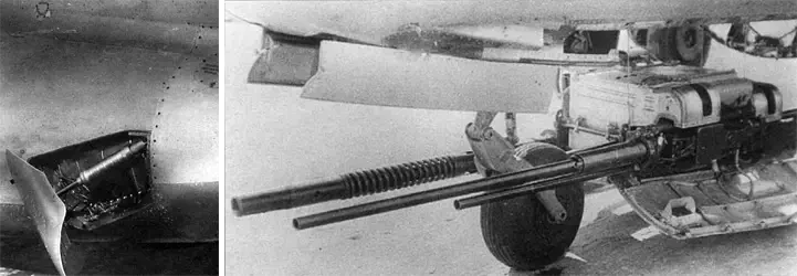 На фото слева: тормозные щитки, расположенные в задней части фюзеляжа. На фото справа: самолет имел на вооружении три пушки, размещающиеся в нижней носовой части фюзеляжа – одну НС-37 (37 мм с боекомплектом на 40 снарядов) и две НС-23 (23 мм с боекомплектом на 80 снарядов)