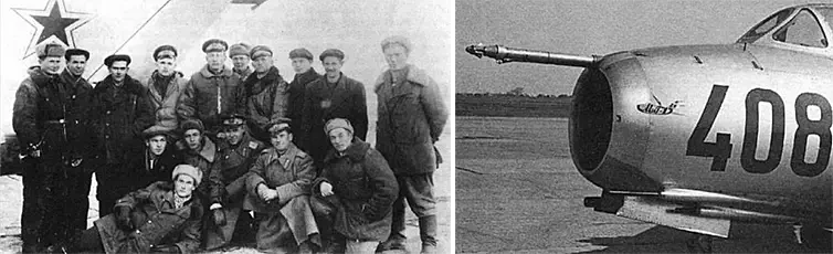На фото слева: участники контрольных испытаний самолета МиГ-15. На фото справа: истребитель МиГ-15бис, оборудованный специальным устройством «Гарпун» для дозаправки в воздухе (более поздняя доработка)