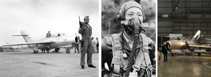 На фото слева: МиГ-15 на американской базе на Окинаве. На фото в центре: летчик Но Кум-Сок. На фото справа: угнанный самолет в Национальном музее ВВС в Дейтоне