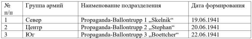 В своих статьях исследователь военной пропаганды Николай Смирнов рассказывает, что также для распространения листовок над тыловыми районами СССР и для воздействия на население крупных советских городов применялись агитационные воздушные шары, ранее успешно показавшие себя в 1940 г. при пропаганде на население Британских островов. Специально для действий на Восточном фронте было создано 3 именных отделения агитационных воздушных шаров, придававшихся группам армий (Север, Центр, Юг).