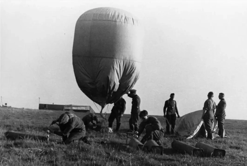 Запуск агитационного аэростата с листовками солдатами из роты пропаганды (Западный фронт, 1939 год)