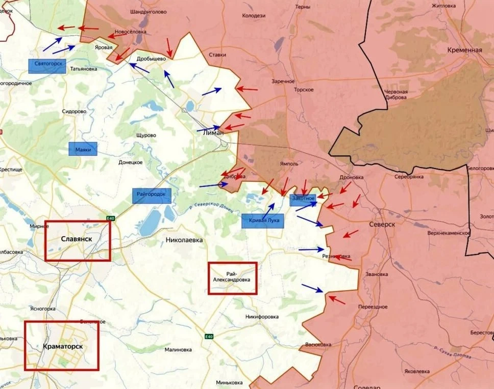 Красный Лиман фактически зажат ВС РФ в клещи. На южном охвате горда ни одной из сторон не удалось установить контроль над Масляковкой. При этом наши подходят к южным окраинам города с другой стороны, от Диброва и ведут бои в лесах парка «Святые горы». На северном охвате города ВС РФ продавили оборону ВСУ и ворвались на северную окраину Красного Лимана, наступают и на запад, к Зелёному Клину. Выбит враг из станции Святогосркая, к которой наша пехота подошла, скрываясь в лесах, избегая опорников ВСУ и населённых пунктов. Соседняя Яровая в «серой зоне», здесь действуют штурмовые группы обеих сторон, сообщает Олег Царёв в Telegram-канале.