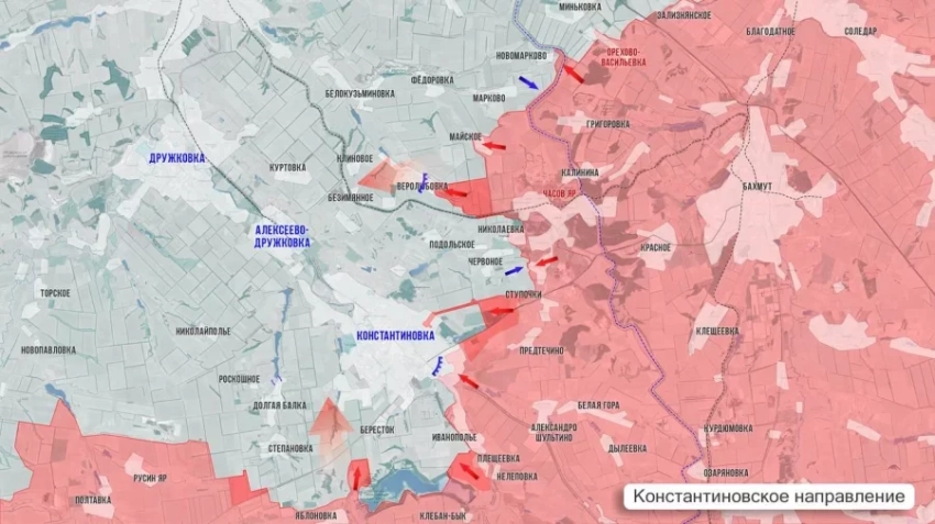 В Константиновке российские подразделения продвигаются на юге, в районе одной из главных магистралей - улицы Соборности, а также на северо-востоке города. По позициям ВСУ в западной части города плотно работают российские расчёты БПЛА.