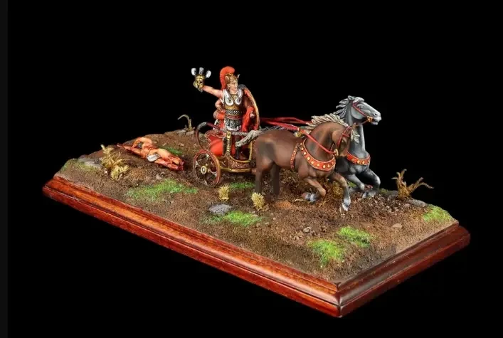На рубеже XIII–XII веков до н. э. греками также использовались боевые колесницы: так называемая бига, запряжка из двух коней, в которой находилось два воина, один из которых был вооружён круглым щитом и парой копий. Соответственно, колесница с тремя лошадьми называлась трига, а та, в который их было четыре – квадрига. Колесный бандаж делался из железа. Когда колесницы не использовались, колёса с них в целях лучшей сохранности снимались. Поскольку образы «Илиады» и «Одиссеи» в Греции с течением времени постоянно трансформировались в сторону современности, нет ничего удивительного в том, что их героев греки и намного позднее изображали в доспехах V–IV вв. до н. э. А значит, набор фигурок колесницей фирмы «El Viejo Dragon» вполне допустим!